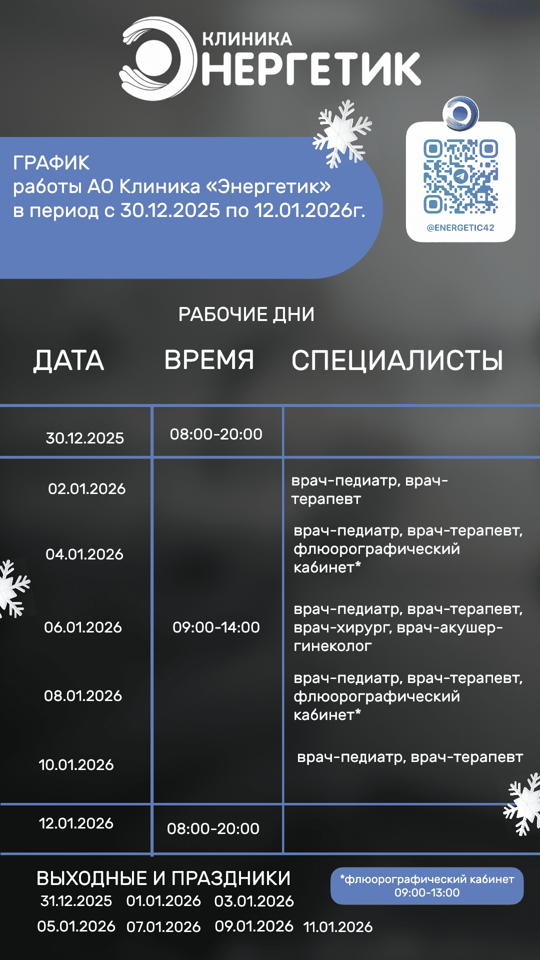 04.01.2026 – с 09:00 до 14:00 – Врач-педиатр, Врач-терапевт, Флюорографический кабинет*